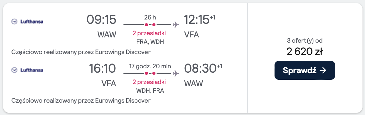 Do Afryki udasz się z warszawskiego portu lotniczego im. Fryderyka Chopina w grudniu. W obie strony polecisz na pokładach samolotów linii Lufthansa oraz Eurowings z przesiadką we Frankfurcie oraz stopem technicznym w Windhuk. Bez dodatkowych kosztów zabrać ze sobą będziesz mógł bagaż podręczny oraz przedmiot osobisty (mały plecak lub damską torebkę).