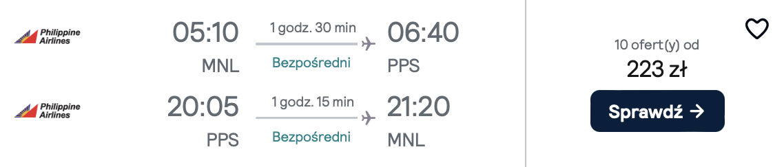 Na Filipiny udasz się w marcu i kwietniu 2025 r. z lotniska w Warszawie. Do Manili polecisz liniami Flydubai oraz Philippine Airlines, z przesiadką w Dubaju. W cenę biletu wliczony jest bagaż podręczny oraz 2 sztuki bagażu rejestrowanego.