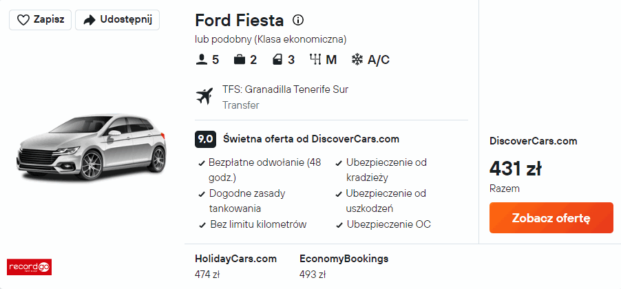 Auto na każdej z wysp to podstawa, pod warunkiem że planujesz połączyć relaks ze zwiedzaniem. Na przykład na Teneryfie za wynajem Forda Fiesty lub podobnego modelu zapłacisz od 62 PLN/doba.