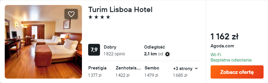 Na miejscu zatrzymasz się w 4* hotelu Turim Lisboa, który znajduje się nieopodal parku Eduardo VII oraz stacji metra Picoas. Z lotniska w okolice miejsca noclegowego dostaniesz się komunikacją publiczną.