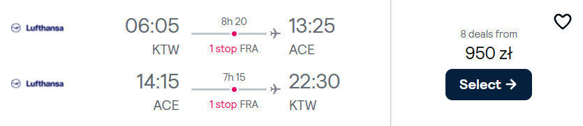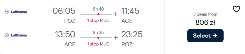 Na hiszpańską wyspę wybrać możesz się z Gdańska, Katowic, Poznania oraz Warszawy w terminach pomiędzy marcem a kwietniem. W obie strony polecisz linią Lufthansa z przesiadkami we Frankfurcie lub Monachium. Na wypoczynek udasz się z bagażem podręcznym oraz przedmiotem osobistym.