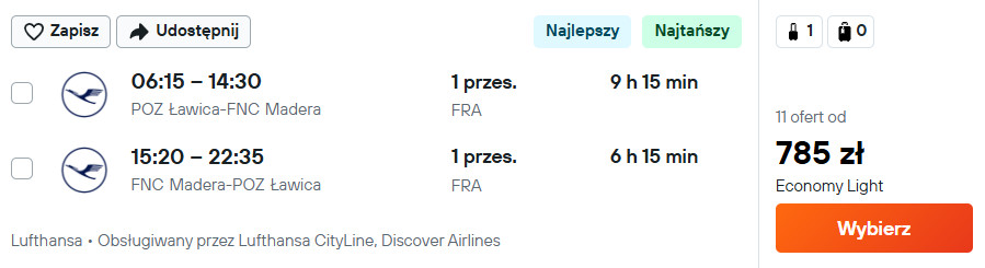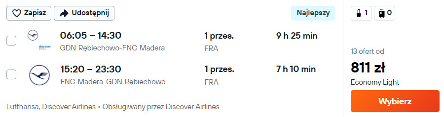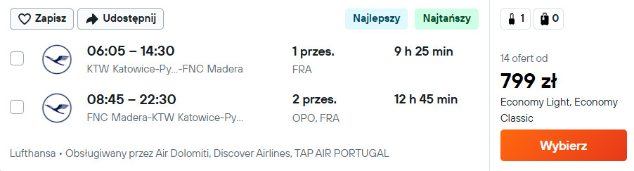 Do Funchal (Madera) wybrać możesz się z Gdańska, Katowic, Krakowa, Poznania oraz Wrocławia. W obie strony podróżować będziesz linią Lufthansa oraz liniami partnerskimi z przesiadkami we Frankfurcie, Monachium oraz Porto (w niektórych kombinacjach). W cenę biletu wliczony jest bagaż podręczny i przedmiot osobisty.