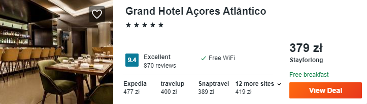 Chcecie nieco więcej luksusu? W takim razie zatrzymajcie się w ekskluzywnym 5* Grand Hotel Acores Atlantico. To obiekt zlokalizowany przy samym wybrzeżu, więc będziecie mogli podziwiać piękny ocean. Na miejscu będziecie mogli odpocząć nad basenem. W cenie zawarto pyszne śniadania.