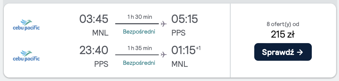 Do Azji udasz się z warszawskiego lotniska im. Chopina w okresie między wrześniem a listopadem. Na Filipiny polecisz na pokładach samolotów linii Air China z przesiadkami w Pekinie. W cenę biletów wliczono bagaż rejestrowany (nadawany do luku) oraz podręczny. Z Manili tanio możesz wybrać się na Palawan lub na Cebu.
