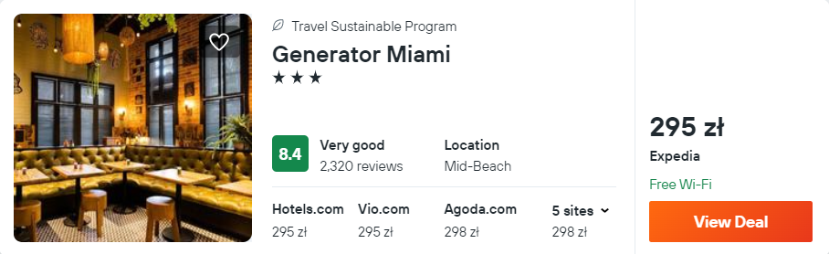 W Miami proponuję ci noclegi w 3* hotelu Generator, który od plaży oddalony jest o 100 metrów. Na terenie obiektu mieści się odkryty basen, a we wszystkich pomieszczeniach będziesz mieć zapewniony dostęp do sieci WiFi.