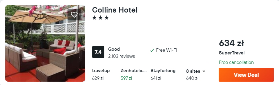 Możesz także zatrzymać się w 3* hotelu Collins, który znajduje się w odległości 50 metrów od najbliższej plaży. Każdy pokój wyposażony został w klimatyzację, telewizor LCD, lodówkę oraz ekspres do kawy. W łazience jest wanna z prysznicem oraz suszarka do włosów.