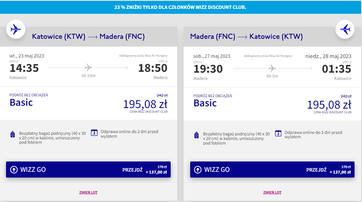 W obie strony polecicie bezpośrednio na pokładach samolotów linii Wizz Air z wliczonym małym bagażem podręcznym. Bilety w najniższej cenie dostępne są dla osób z Wizz Discount Club. Chętni na loty bez WDC zapłacą nieco więcej.