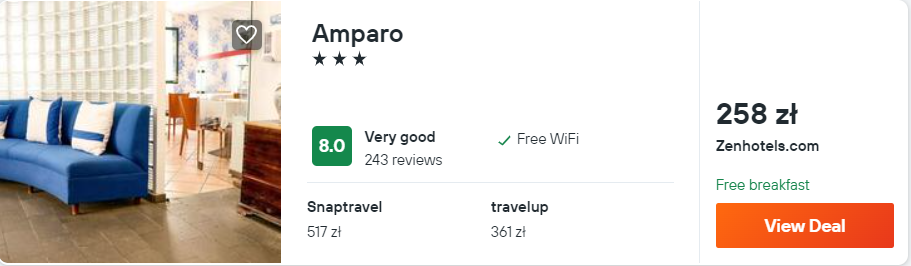 Nie wiele więcej kosztować was będzie pobyt z codziennymi śniadaniami w 3* hotelu Amparo. Wszystkie pokoje zostały wyposażone w klimatyzację, telewizor oraz czajnik elektryczny. W każdym jest łazienka z wanną i prysznicem. Na terenie całego obiektu będziecie mieć zapewniony dostęp do sieci WiFi.