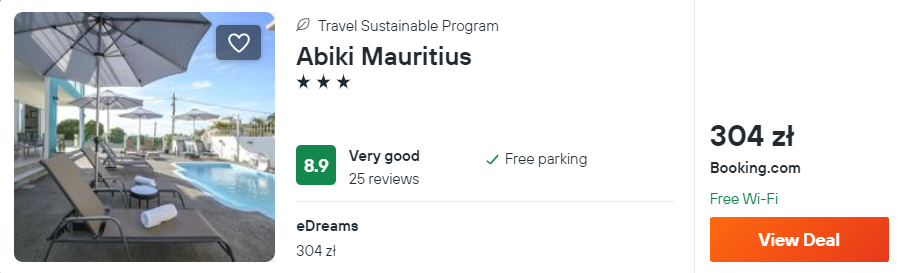 Możesz także zatrzymać się w 3* hotelu Abiki Mauritius z odkrytym basenem oraz tarasem słonecznym. Znajduje się w odległości 500 metrów od plaży Albion. Każdy apartament składa się z aneksu kuchennego, salonu, sypialni oraz łazienki. Na terenie całego obiektu będziesz mieć zapewniony dostęp do sieci WiFi.
