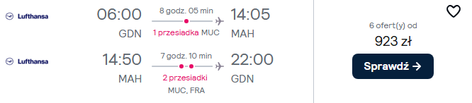 Na Minorkę wybierzesz się w terminie 26 lipca – 2 sierpnia 2025 r. Do Hiszpanii polecisz z Lufthansą z przesiadkami we Frankfurcie lub Monachium. Jako miejsce początkowe wycieczki możesz wybrać Gdańsk, Katowice, Poznań, Rzeszów lub Wrocław.