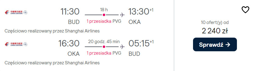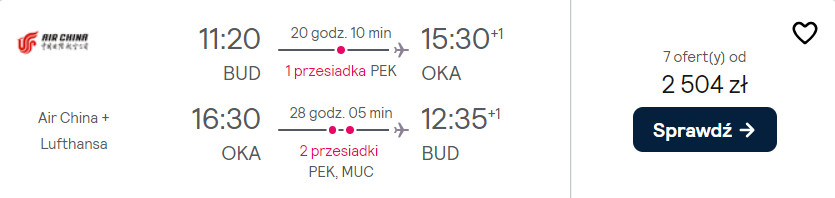 Do Japonii udasz się z portu lotniczego im. Ferenca Liszta w Budapeszcie w okresie pomiędzy styczniem a marcem. W obie strony polecisz na pokładach samolotów linii Air China lub China Eastern z wygodnymi przesiadkami na lotniskach w Szanghaju, Pekinie oraz na terenie Niemiec. W cenie biletu zabrać ze sobą możesz bagaż rejestrowany (nadawany do luku), podręczny oraz przedmiot osobisty (mały plecak lub damską torebkę).