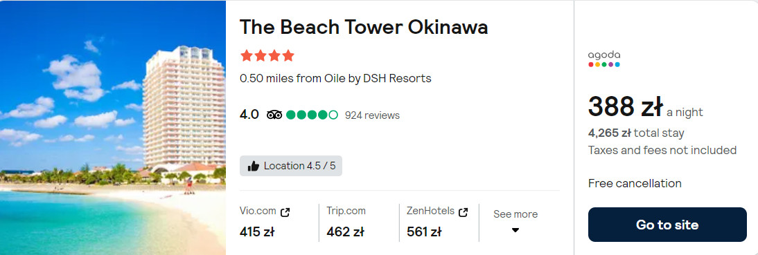 Możesz także zatrzymać się w 4* hotelu The Beach Tower Okinawa, który położony jest tuż przy plaży Sunset. Na terenie całego obiektu będziesz mieć zapewniony dostęp do sieci WiFi. Dla hotelowych gości dostępny jest także bezpłatny parking.