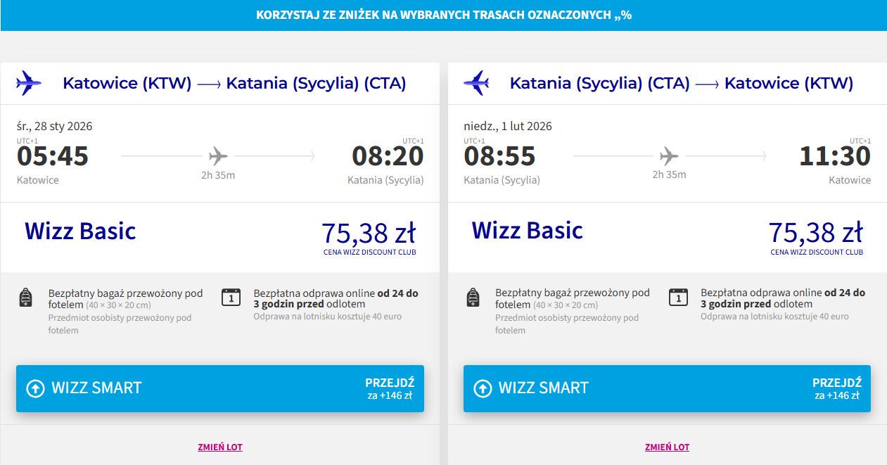 Bilety w najniższych cenach dostępne są dla osób z Wizz Discount Club. Chętni na loty bez WDC zapłacą 238 PLN (w obie strony).