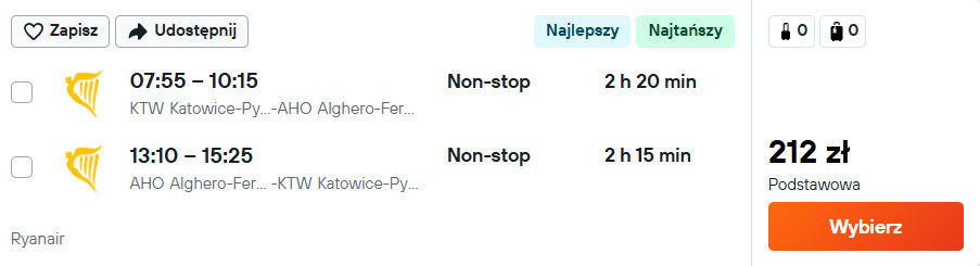 Do Alghero polecisz z Katowic oraz lotniska w Modlinie. Natomiast do Olbii czekają cię loty z Krakowa. Na każdej trasie podróżować będziesz linią Ryanair z bagażem podręcznym.