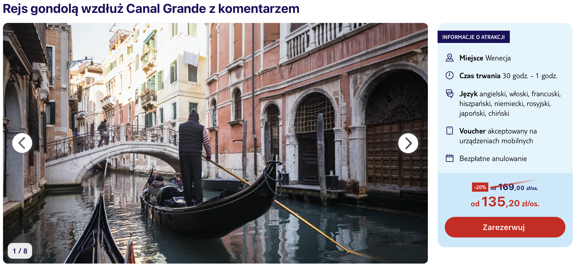Weźcie udział w romantycznym rejsie gondolą wzdłuż cieśniny Canal Grande i podziwiajcie najlepsze widoki na miasto, w tym teatr La Fenice i Pałac Dożów.
