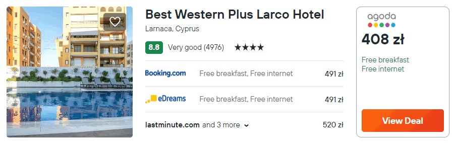 W Larnace rekomenduję ci noclegi ze śniadaniami w 4* hotelu Best Western Plus Larco. Znajduje się on w odległości 200 metrów od wybrzeża Morza Śródziemnego. Na terenie obiektu mieści się odkryty basen oraz brodzik dla najmłodszych.
