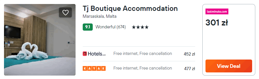 Na Malcie rekomenduję noclegi w 4* hotelu Tj Boutique. Obiekt będzie bardzo dobrą bazą wypadową do zwiedzania wyspy. Na miejscu skorzystasz z nowocześnie urządzonego pokoju z prywatną łazienką i klimatyzacją.