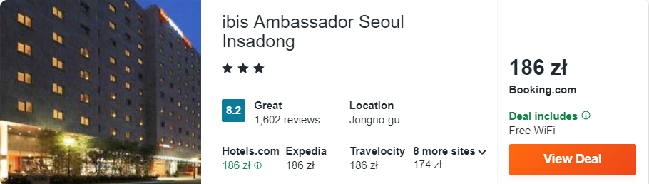 W stolicy Korei Południowej rekomenduję wam noclegi w 3* hotelu ibis Ambassador Seoul Insadong, który oddalony jest o 5 minute spacerem od tradycyjnej ulicy kulturalnej Insadong oraz 10 minut spacerem od pałacu Changdeokgung i Changgyeongung.