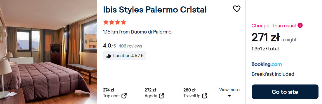 Zarezerwuj pobyt w 4* hotelu Ibis Styles Palermo Cristal. Jest to świetna baza noclegowa w samym sercu Palermo z doskonałą lokalizacją, skąd do wielu atrakcji dotrzesz spacerem. Ponadto w cenę wliczone są codzienne śniadania.