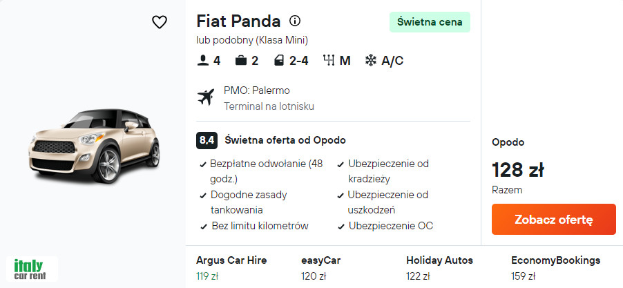 Zachęcam cię do wypożyczenia samochodu po przylocie do Palermo. Mając do swojej dyspozycji auto, łatwo i wygodnie dojedziesz do miejsca zakwaterowania, miasteczka Cefalu, ciekawego Castellammare del Golfo oraz do starożytnego Agrigento.