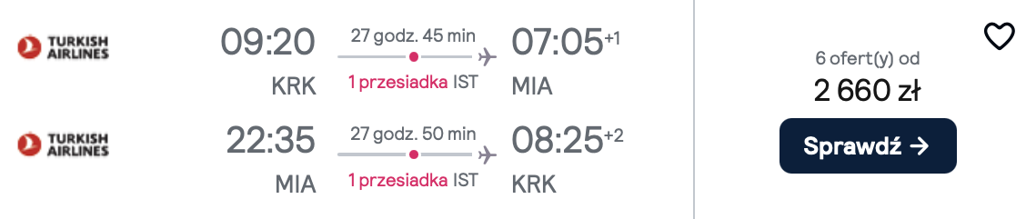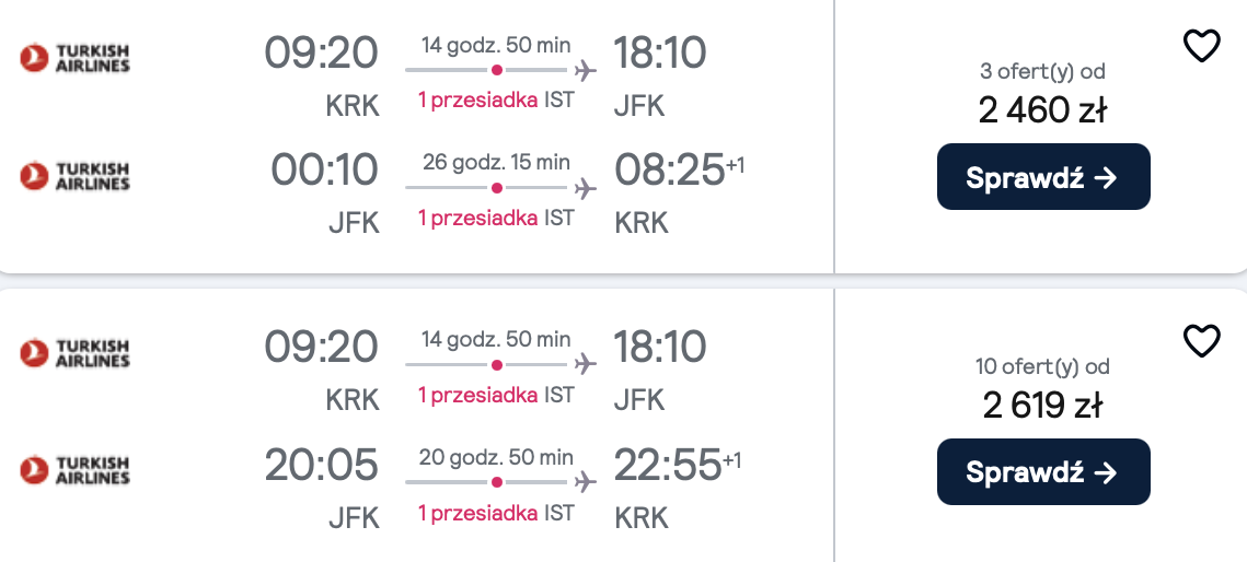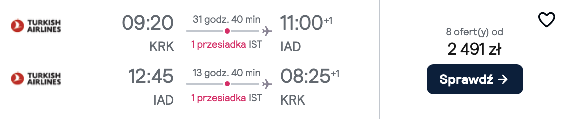 Na wycieczkę wybierzesz się z Turkish Airlines. Możesz polecieć do Seattle, San Francisco, Nowego Jorku, Los Angeles, Waszyngtonu i Miami. Dostępne są wyloty z Krakowa.