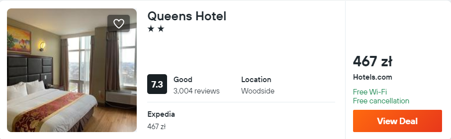 W Nowym Jorku rekomenduję ci noclegi w hotelu Queens, który położony jest nieopodal stacji metra 61 St – Woodside. Każdy pokój składa się z aneksu kuchennego, miejsca do relaksu i spania oraz łazienki z wanną i prysznicem. Na terenie całego obiektu będziesz mieć zapewniony dostęp do sieci WiFi.