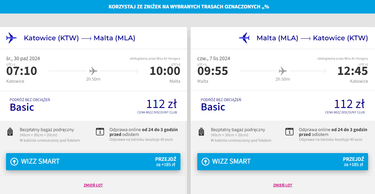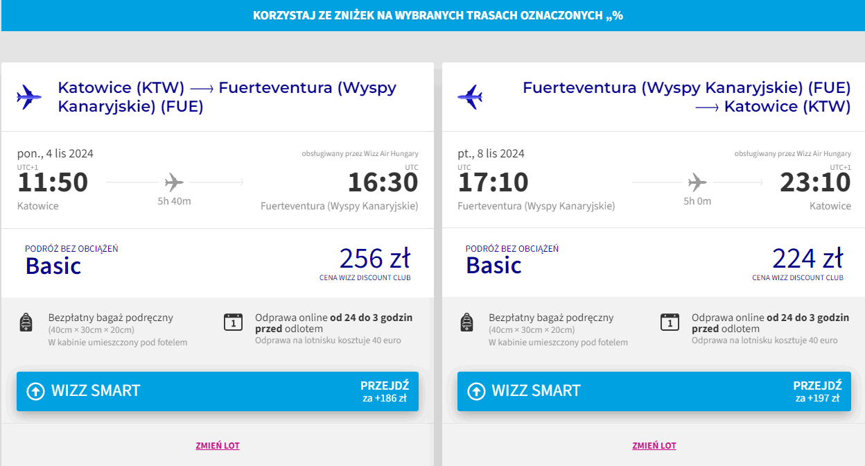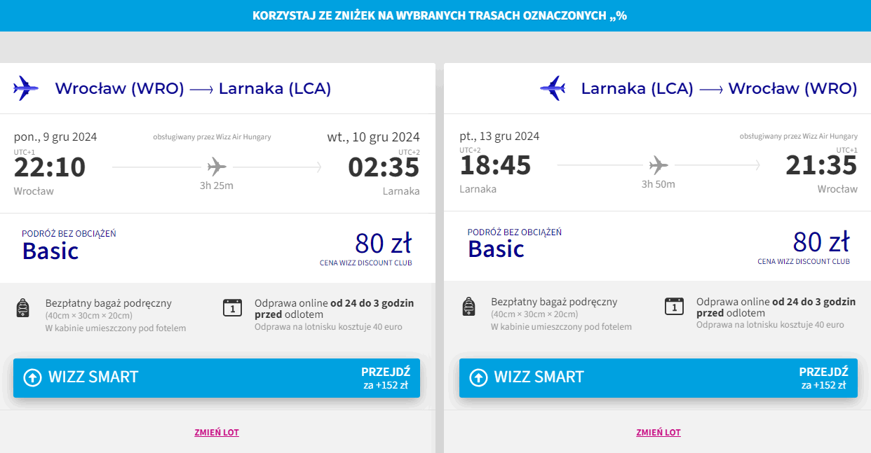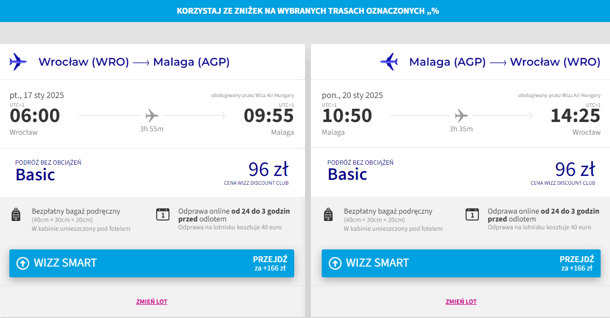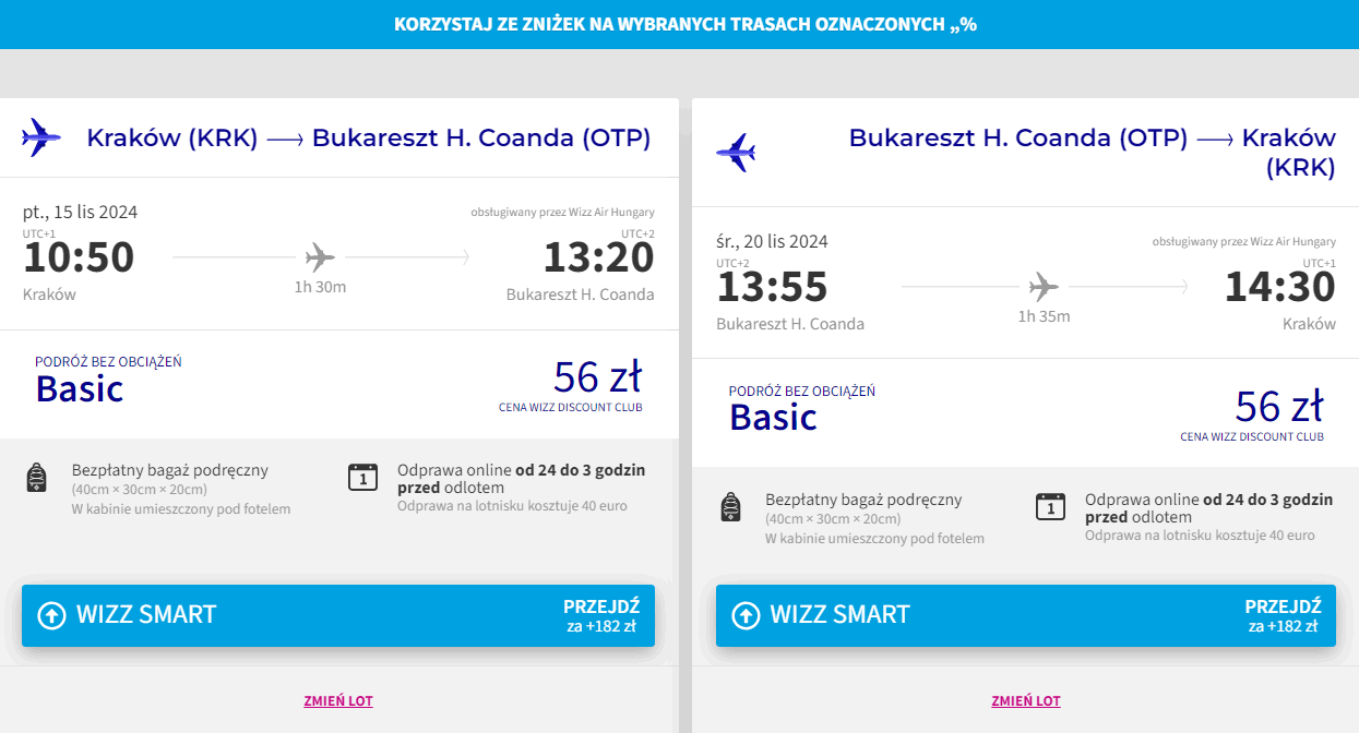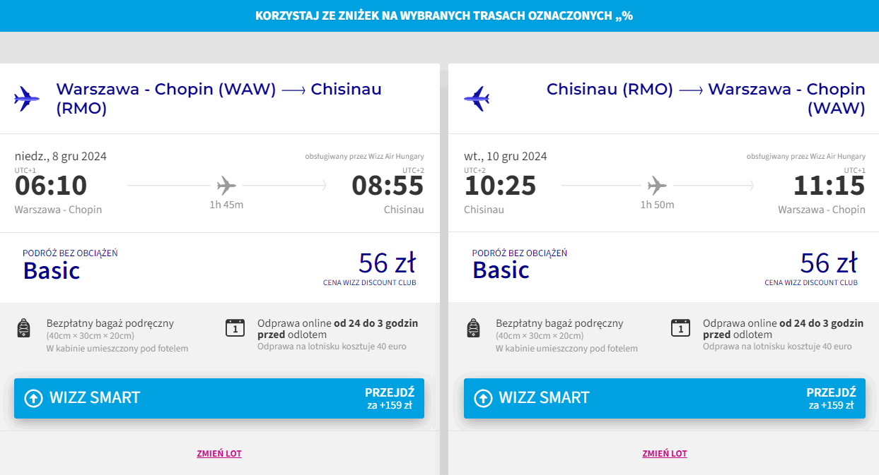 Na każdej trasie polecisz bezpośrednio linią Wizz Air z wliczonym bagażem podręcznym. Bilety w najniższej cenie dostępne są dla członków Wizz Discount Club.