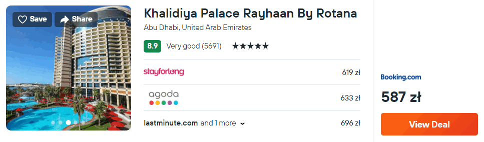 Natomiast w Abu Zabi rozważ propozycję zakwaterowania w 5* hotelu Khalidiya Palace Rayhaan By Rotana, który znajduje się w pobliżu Pałacu Prezydenckiego. Na terenie obiektu mieszczą się dwa baseny oraz dobrze wyposażone centrum fitness.