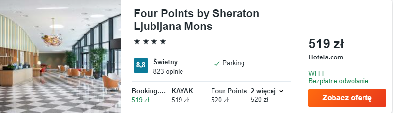 Wybrałem dla was noclegi w stylowym 4* hotelu Four Points by Sheraton Ljubljana Mons. Będzie to świetny wybór na weekendową wycieczkę: komfortowo urządzone pokoje, doskonała lokalizacja oraz światowej klasy obsługa zapewnią wam wypoczynek na najwyższym poziomie.