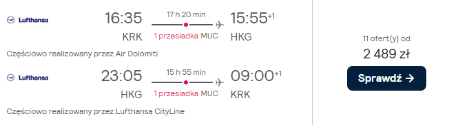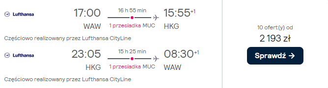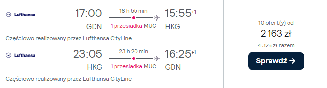 W podróż do Azji udasz się z jednego z 5 miast w Polsce (szczegóły poniżej). Czekają cię loty do Hongkongu realizowane na pokładzie samolotów linii lotniczej Lufthansa z bezpiecznymi, gwarantowanymi przez przewoźnika przesiadkami w Monachium.