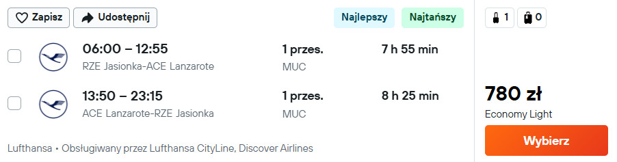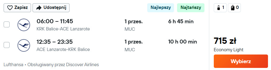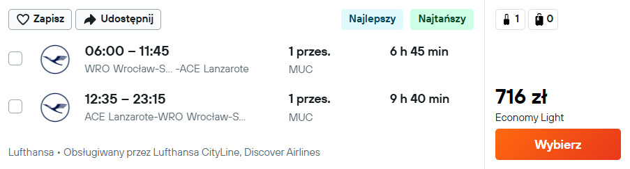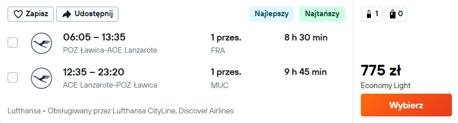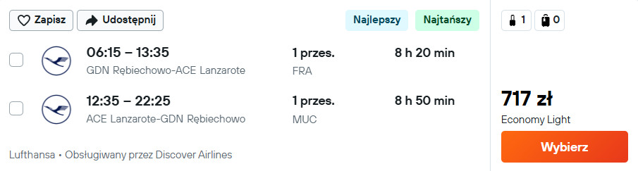 Na Wyspy Kanaryjskie wybrać możesz się z Gdańska, Katowic, Krakowa, Poznania, Rzeszowa i Wrocławia. Na każdej trasie podróżować będziesz linią Lufthansa z przesiadką we Frankfurcie lub Monachium. W cenę biletu wliczony jest bagaż podręczny i przedmiot osobisty.
