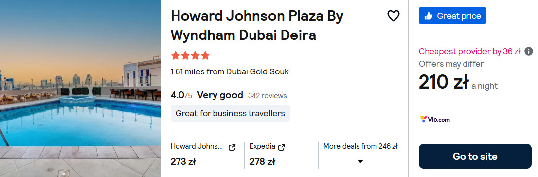 Port, z którego ruszysz w rejs zlokalizowany jest nieopodal Bur Dubai. Dlatego też proponuję ci nocleg w tej części miasta. Jedna noc w 4* hotelu z basenem na dachu za 210 PLN, to chyba nie jest wygórowana cena – prawda?