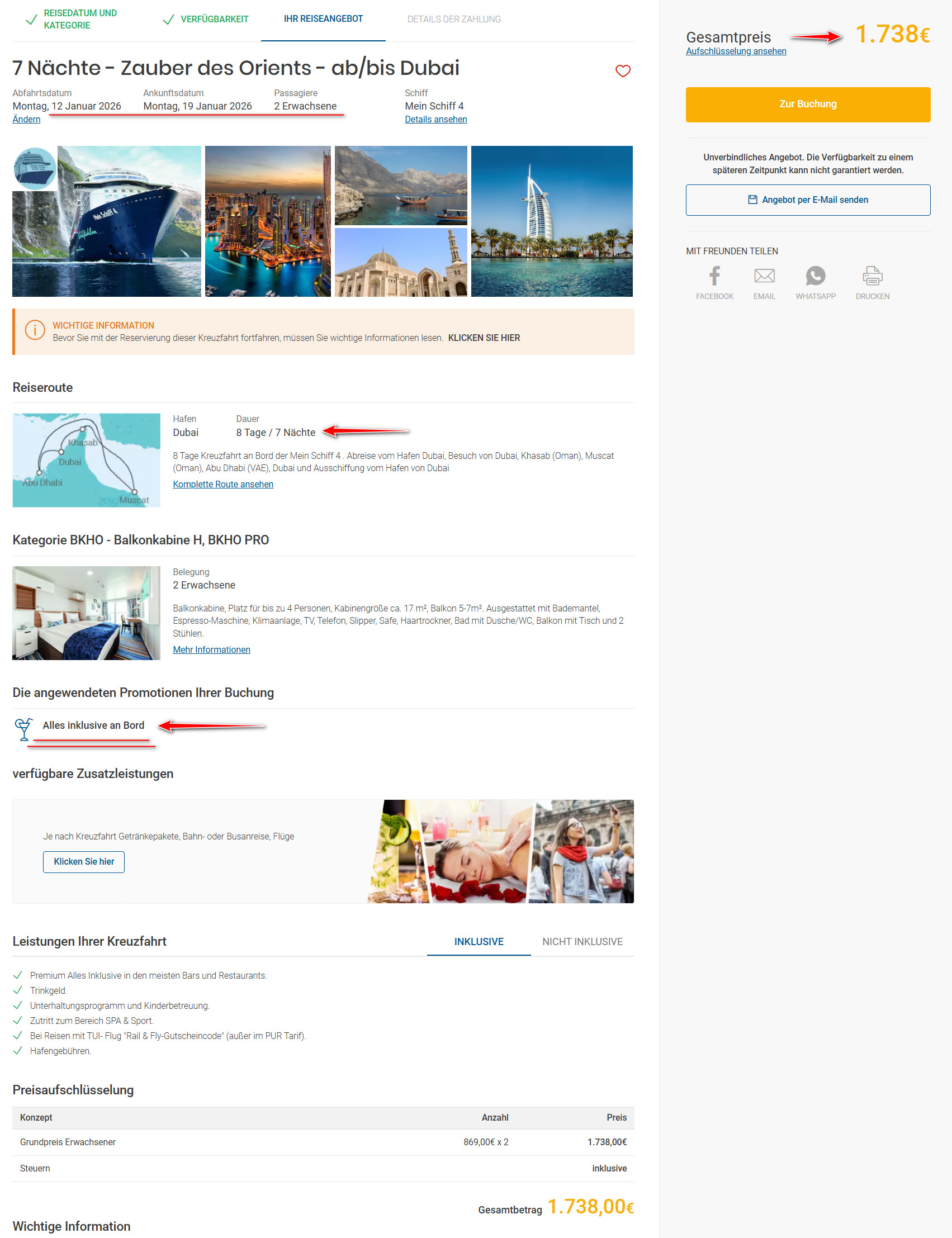 W terminie 12-19 stycznia odbędziesz rejs wycieczkowcem Mein Schiff 4. Statek wypływa i wraca do portu w Dubaju.