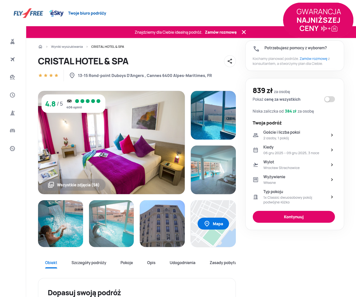 Na miejscu czeka na ciebie pobyt w komfortowym 4* hotelu Cristal. Do twojej dyspozycji będzie między innymi basen, sauna oraz strefa spa, w której zrelaksujesz się po spacerze wybrzeżem. Obiekt zlokalizowany jest w centrum Cannes, będzie więc doskonałą bazą wypadową do zwiedzania.