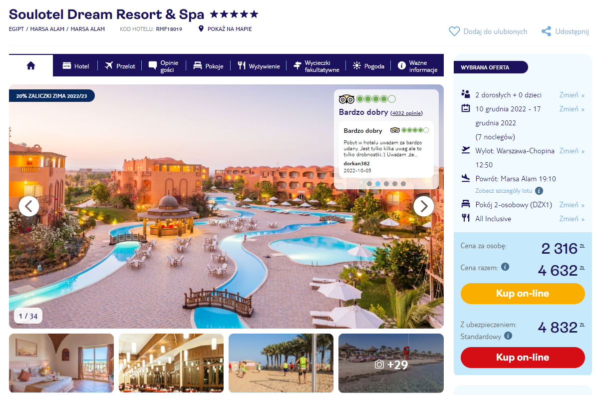Wczasy spędzisz w bardzo dobrze ocenianym 5* hotelu Soulotel Dream Resort & Spa. Położony niedaleko plaży, oferuje wspaniałe widoki na morze oraz doskonałe warunki do wypoczynku nad wodą. Chętni będą mogli spróbować swoich sił w eksploracji podwodnego świata w pobliskiej szkole nurkowania. Dla gości przygotowano również zróżnicowaną ofertę wyżywienia w formule all inclusive.