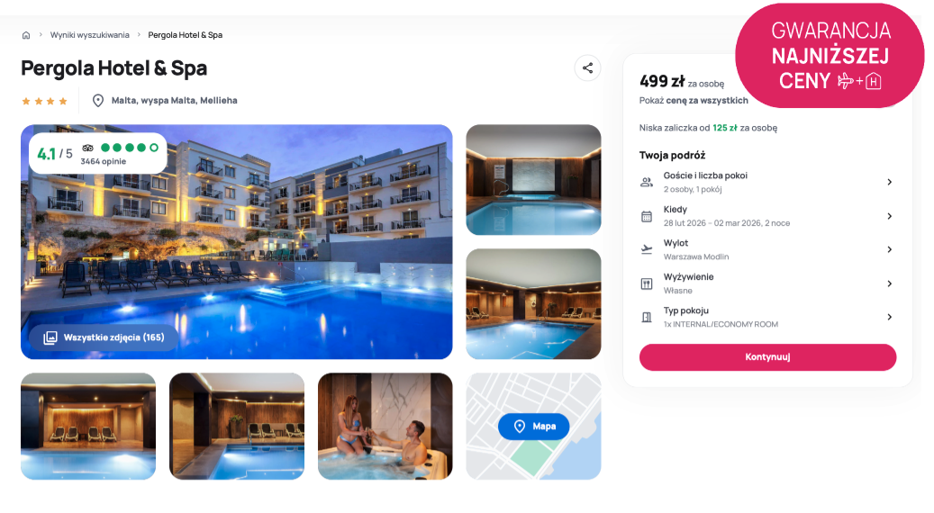 Na wyspie zatrzymasz się w 4* hotelu Pergola. Goście chwalą hotel za wspaniałe widoki na zatokę Mellieha oraz wyspy Gozo i Comino. Obiekt dysponuje dwoma basenami zewnętrznymi, centrum spa z sauną oraz siłownią. Pokoje są wyposażone w minibar i balkon. Hotel położony jest zaledwie 4 minuty jazdy od plaży Mellieha Bay i 13 minut od Golden Sands Beach.