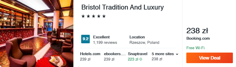 5* hotel Bristol Tradition And Luxury to obiekt położony w samym sercu Rzeszowa. Na terenie całego hotelu działa bezpłatne Wi-Fi, a do dyspozycji gości oddano m.in. strefę spa & wellness oraz restaurację serwującą m.in. sushi.