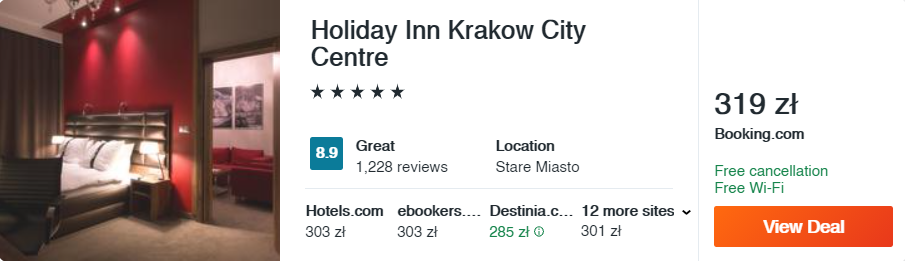 Dowiedzcie się więcej o tym hoteluWybieracie się do Krakowa? Zatrzymajcie się w 5* hotelu Holiday Inn, który może pochwalić się świetną lokalizacją – w centrum starej części miasta. Wszystkie pokoje w obiekcie są klimatyzowane i posiadają prywatne łazienki z bezpłatnym zestawem kosmetyków.