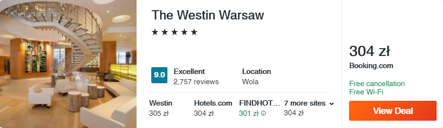 Dowiedzcie się więcej o tym hotelu5* hotel The Westin położony jest w centrum biznesowej części Warszawy, zaledwie kilka kroków od słynnego Pałacu Kultury i Nauki. Obiekt oferuje komfortowe pokoje z widokiem na miasto.