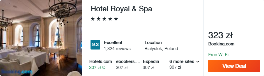 Dowiedzcie się więcej o tym hoteluWycieczka na Podlasie? Czemu nie! Wybierzcie się do Białegostoku i zatrzymajcie się w 5* hotelu Royal & Spa, który cieszy się doskonałymi opiniami wśród dotychczasowych gości. Na terenie obiektu można korzystać m.in. z salonu kosmetycznego, strefy spa & wellness oraz świetnej restauracji.