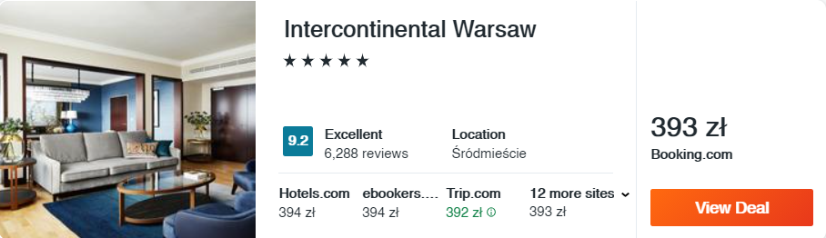 Dowiedzcie się więcej o tym hoteluNa koniec najbardziej pożądany obiekt w stolicy kraju – 5* hotel Intercontinental. Skorzystajcie ze świetnej (jak na ten hotel) ceny noclegów i wybierzcie się do Warszawy, by korzystać m.in. z basenu z widokiem na Pałac Kultury i Nauki, świetnej restauracji oraz strefy spa & wellness.