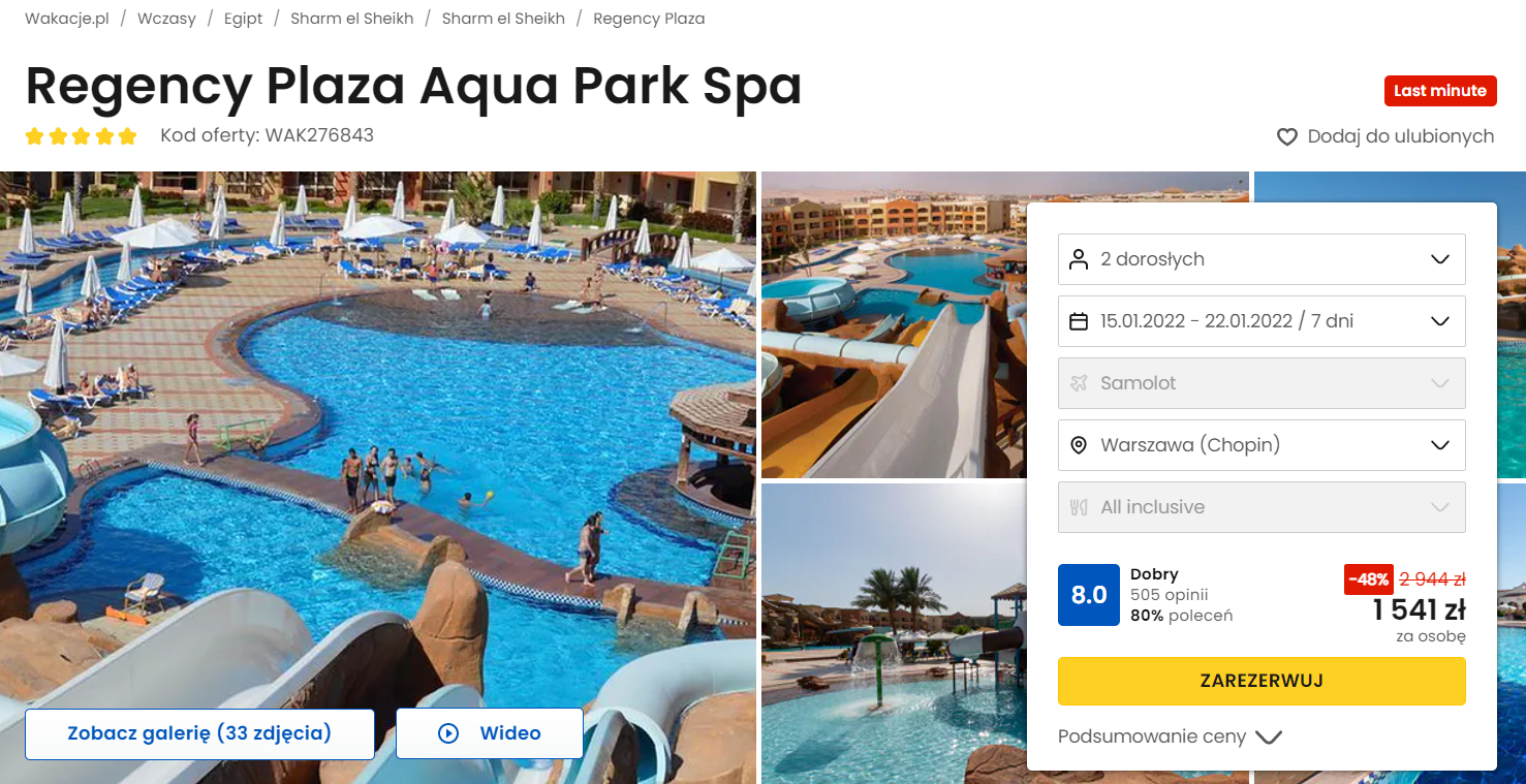 Do Egiptu wybierzecie się jeszcze w tym tygodniu i spędzicie tam aż 7 dni w luksusowym 5* hotelu Regency Plaza Aqua Park Spa. W obiekcie do waszej dyspozycji będą cztery baseny, brodzik dla dzieci oraz aquapark oferujący 5 zjeżdżalni dla dorosłych i część dla najmłodszych z małymi zjeżdżalniami. W każdym pokoju znajdziecie klimatyzację, Wi-Fi oraz prywatną łazienkę z bezpłatnym zestawem kosmetyków.