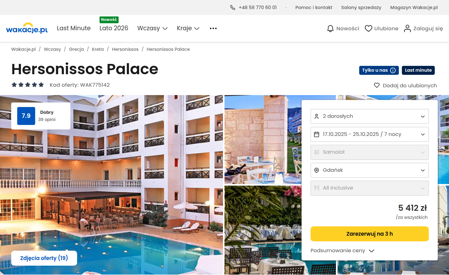 Na miejscu czeka na ciebie luksusowy Hersonissos Palace – 5* hotel w postmodernistycznym stylu z elementami greckiej architektury neoklasycznej. Goście chwalą obiekt za świetną lokalizację – zaledwie 60 metrów od plaży i 500 metrów od centrum tętniącego życiem Hersonissos. Do dyspozycji masz klimatyzowane pokoje z balkonem lub tarasem, baseny wewnętrzne i zewnętrzne, saunę oraz centrum fitness. Bar na pierwszym piętrze oferuje nie tylko doskonałe koktajle, ale i zapierające dech w piersiach widoki na Morze Kreteńskie.