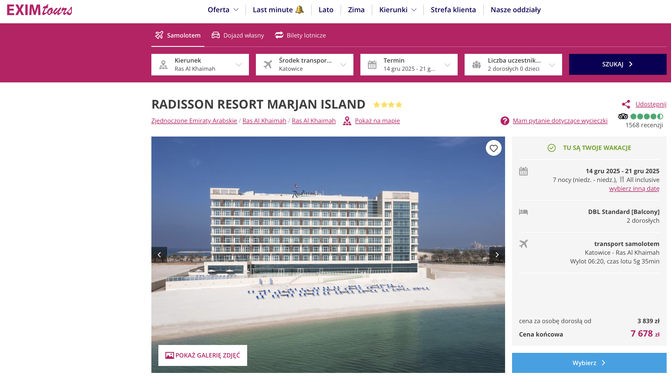 Wylot do Zjednoczonych Emiratów Arabskich zaplanowano na 14 grudnia, a powrót 21 grudnia. Dostępne są wyloty z kilku polskich miast, w tym z Warszawy, Krakowa, Gdańska, Katowic, Poznania, Rzeszowa i Wrocławia. W zależności od wybranego miasta wylotu, w cenę wliczony jest bagaż podręczny, a w niektórych opcjach także bagaż rejestrowany.