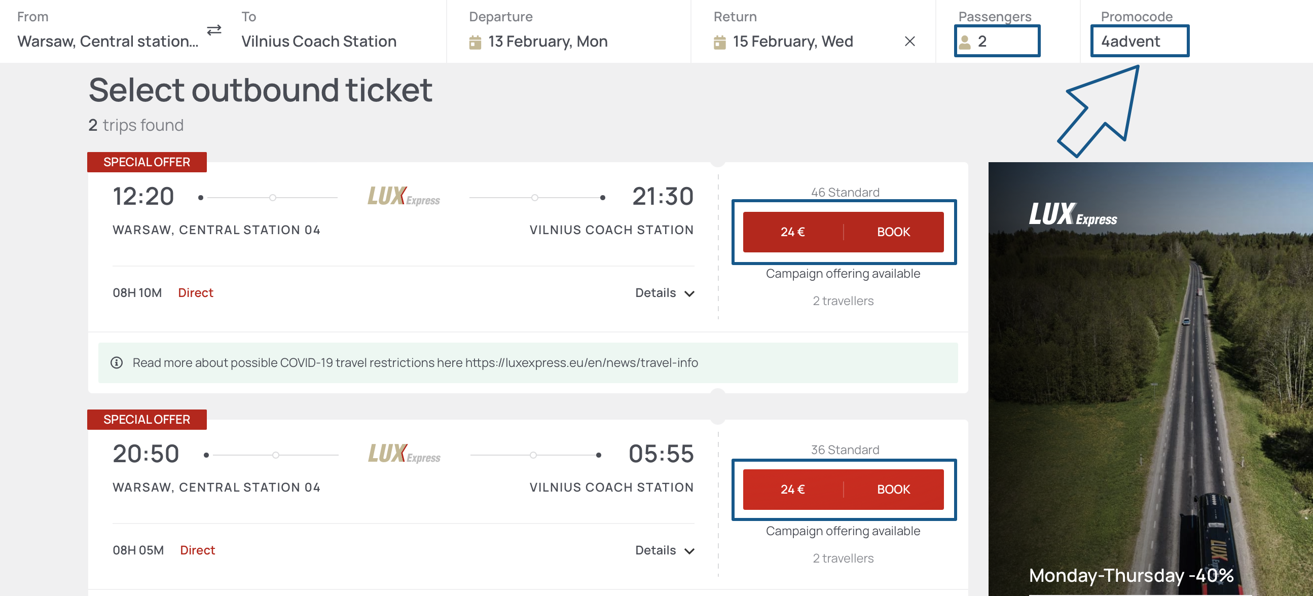 Do Wilna pojedziesz komfortowymi autokarami Lux Express. Dostępnych jest mnóstwo terminów od stycznia do końca lutego (także na ferie zimowe, walentynki i weekendy) w cenie 12 EUR w jedną stronę za osobę. Aby skorzystać z promocji, należy wpisać kod: 4advent.