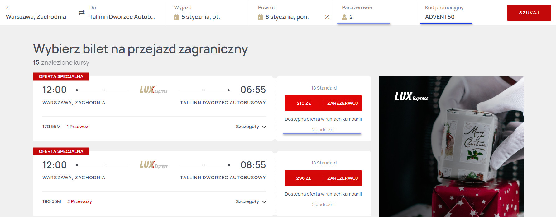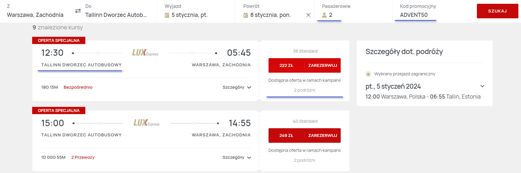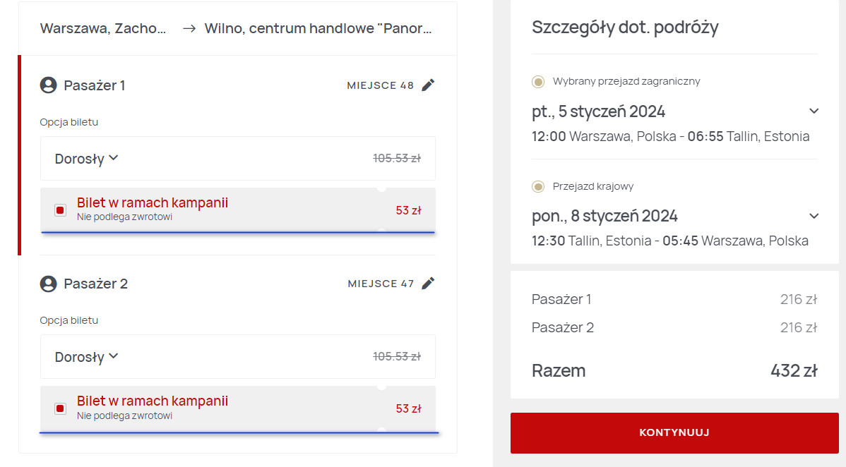 W ramach aktualnej akcji możesz zarezerwować bilety na przejazdy (nowoczesnym autokarem firmy Lux Express) z Warszawy do stolicy Estonii w atrakcyjnych cenach. Warunek jest jeden: zawsze podróżować musisz w parze! Dostępnych jest dużo terminów (także na weekendy!) pomiędzy 2 stycznia a 29 lutego 2024 roku.