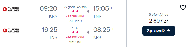 Na afrykańską wyspę możesz polecieć w przyszłym roku, np. w terminie 17 – 25 stycznia. Czeka cię podróż z Krakowa do Antananarywy z Turkish Airlines. Po drodze zaplanowane są przesiadki w Stambule oraz stop techniczny na Mauritiusie (bez opuszczania samolotu). Dłuższe transfery nad Bosforem możesz wykorzystać do szybkiego zwiedzenia miasta.