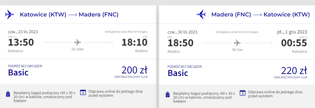 Podróż w najniższej cenie zakupią posiadacze Wizz Discount Club, pozostałe osoby zapłacą nieco więcej. Bez dodatkowych opłat możesz zabrać ze sobą bagaż podręczny.