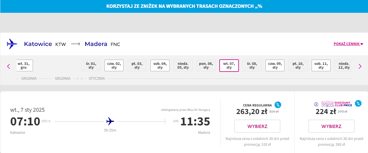 Na Maderę polecisz bezpośrednio (7 stycznia) z Katowic linią Wizz Air. Z portugalskiej wyspy na „Kanary” udasz się 13 stycznia linią Binter Canarias. Na Górny Śląsk wrócisz z Teneryfy bezpośrednim lotem linii Wizz Air. Wylot jest zaplanowany na 17 stycznia.