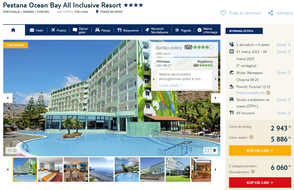 Będziecie zakwaterowani we wspaniałym 4* hotelu Pestana Ocean Bay All Inclusive Resort. Z okien pokojów roztacza się widok na ocean. Na miejscu czeka na was podgrzewany basen, zielony ogród oraz oczywiście wyżywienie w formule all inclusive.
